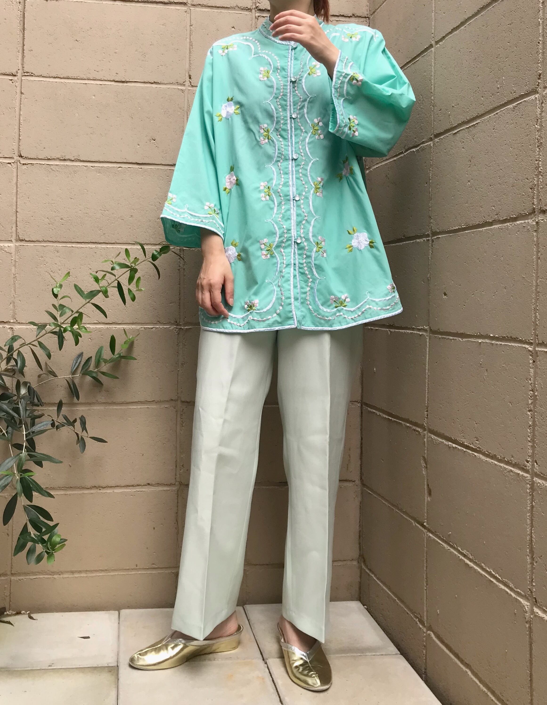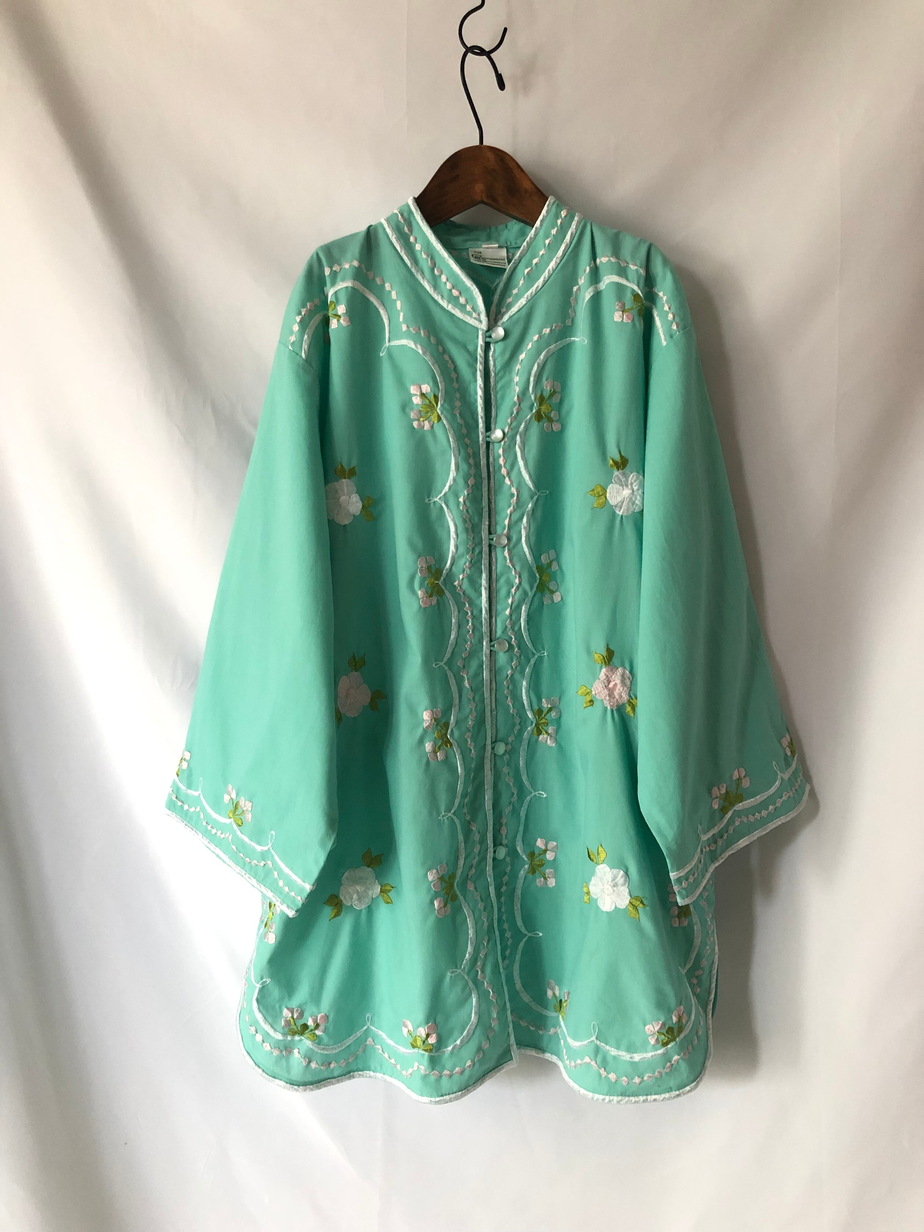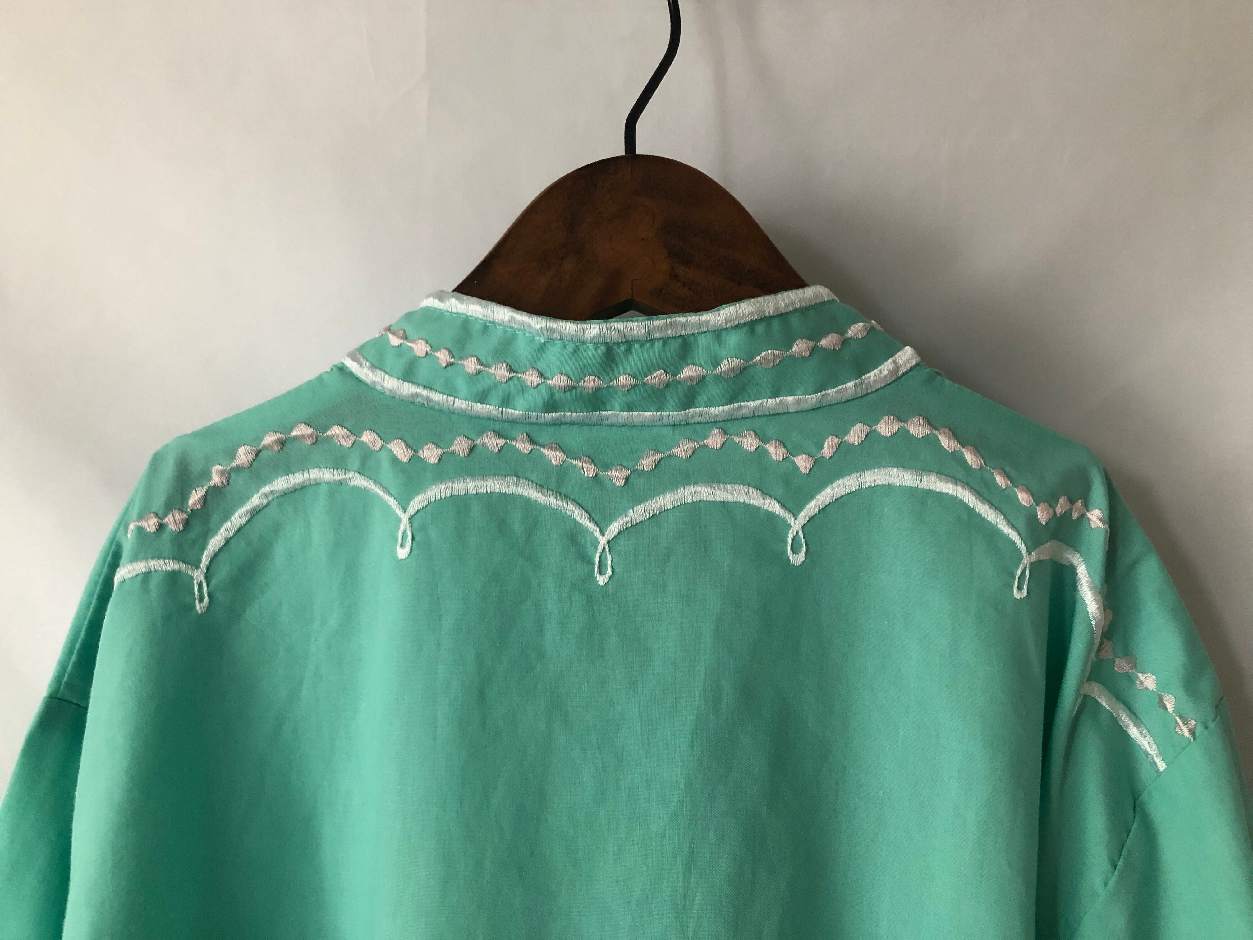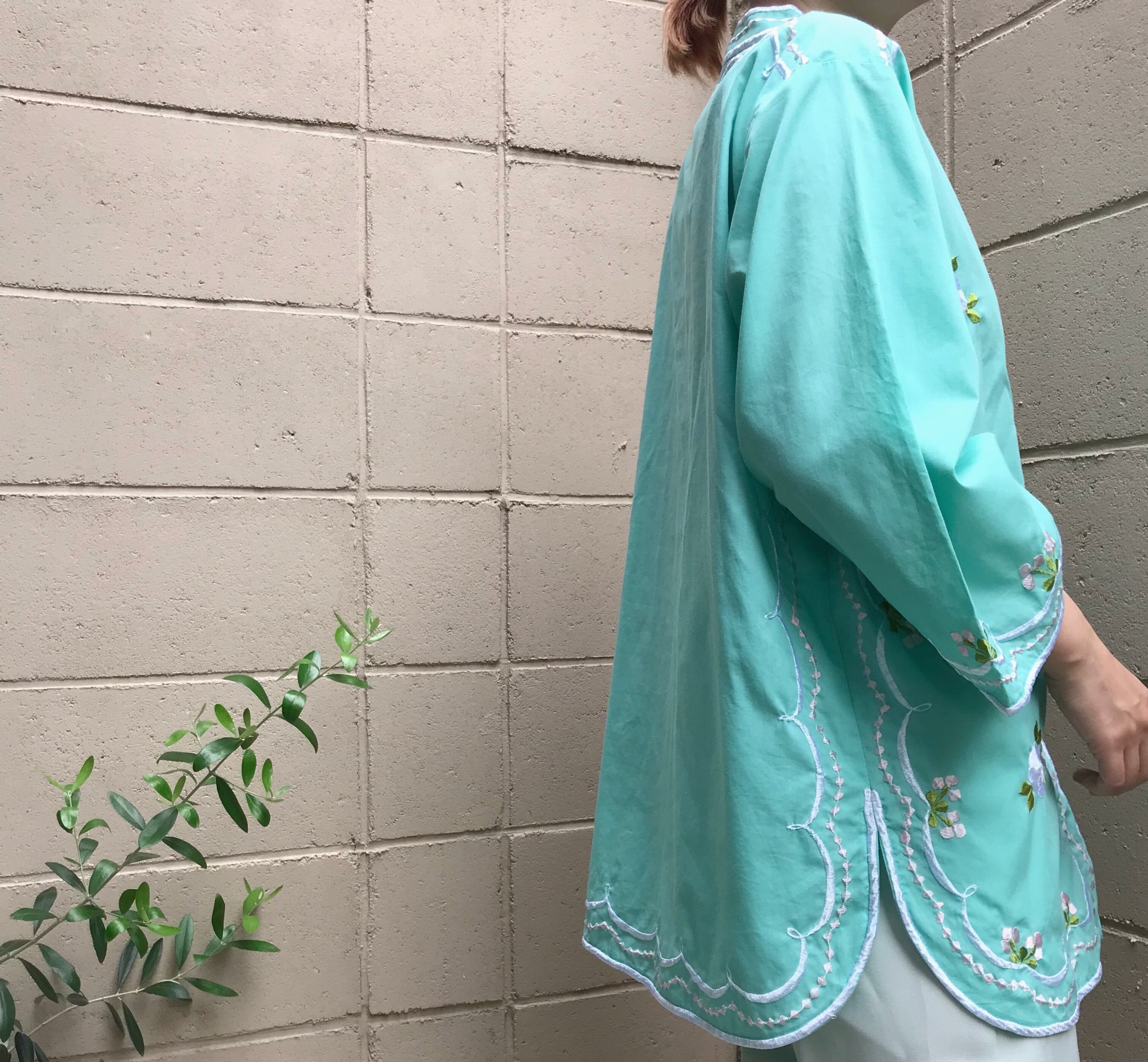 1960s〜70s頃のフィリピン製チャイナ刺繍シャツです。明るいミントグリーンが華やかな一枚です。